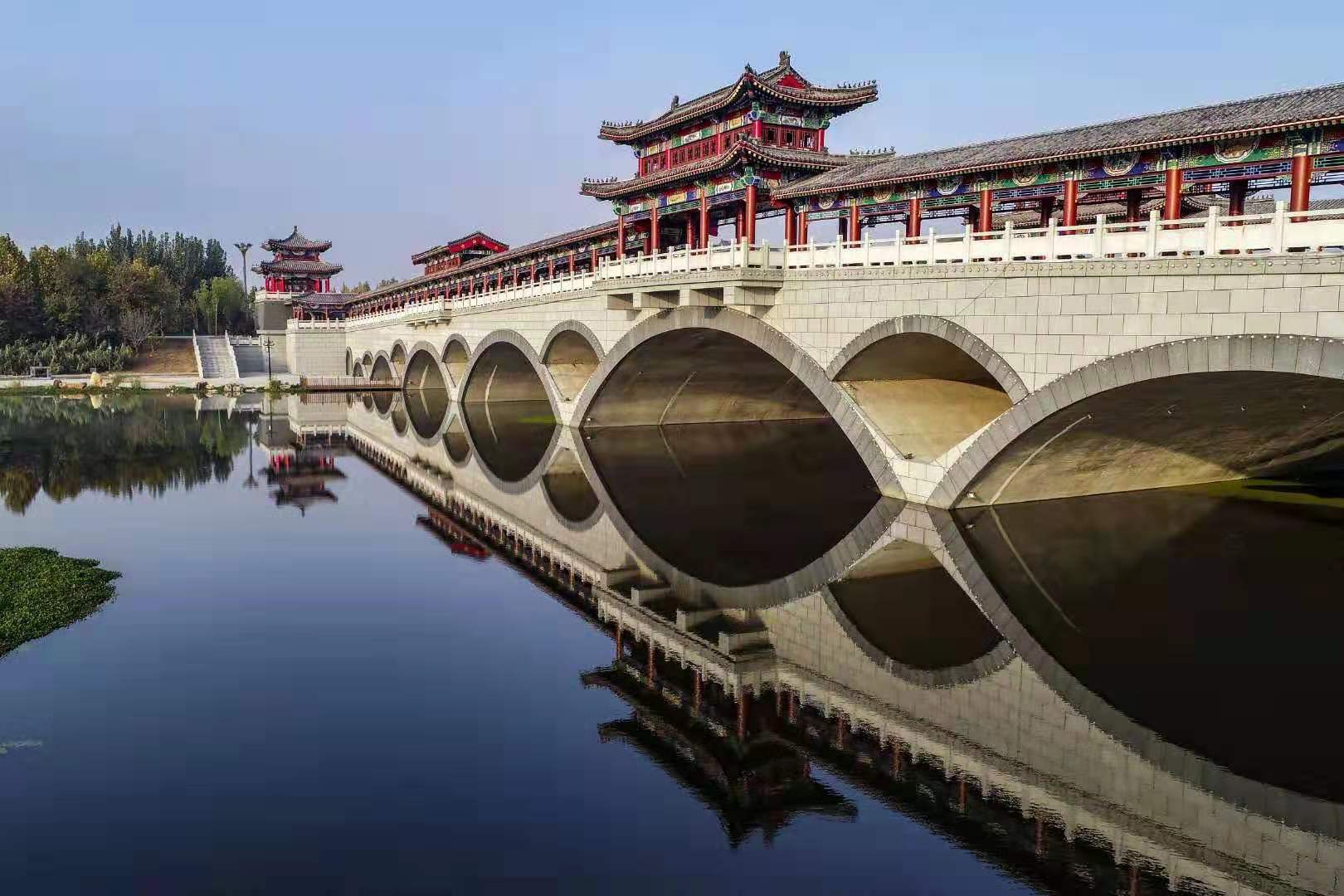 曲阜大沂河興華橋橋梁全長 183.2 米,寬 31.6 米,采用不等跨對稱九連孔板拱橋。在建筑風(fēng)格的選取上充 分結(jié)合周邊環(huán)境及文化內(nèi)涵 ,橋頭各設(shè)置一對鐘鼓樓,左鐘右鼓,跨中設(shè)置“觀川閣”,人行道覆有古典式廊亭, 橋梁結(jié)構(gòu)與造型建筑結(jié)合曲阜地域特色,融入優(yōu)秀傳統(tǒng)文化內(nèi)涵,體現(xiàn)了“古樸、典雅、大氣、人本”的風(fēng)格, 現(xiàn)成為曲阜市地標(biāo)性建筑。